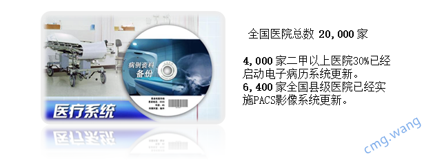 目前在医疗影像存储系统国家推行传统的激光胶片、光存储及云存储并行的行业政策。尤其是北方地区京津冀、山西、内蒙、东北、山东、河南等多个省份已将光存储写进了价格目录中,为光存储在医疗行业的应用提供了有利条件。