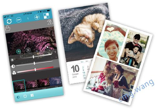 • 内建多种滤镜效果与边框、拼贴,还可自制月历与各