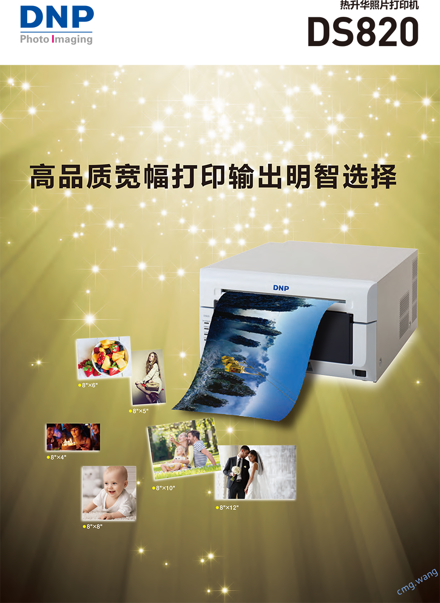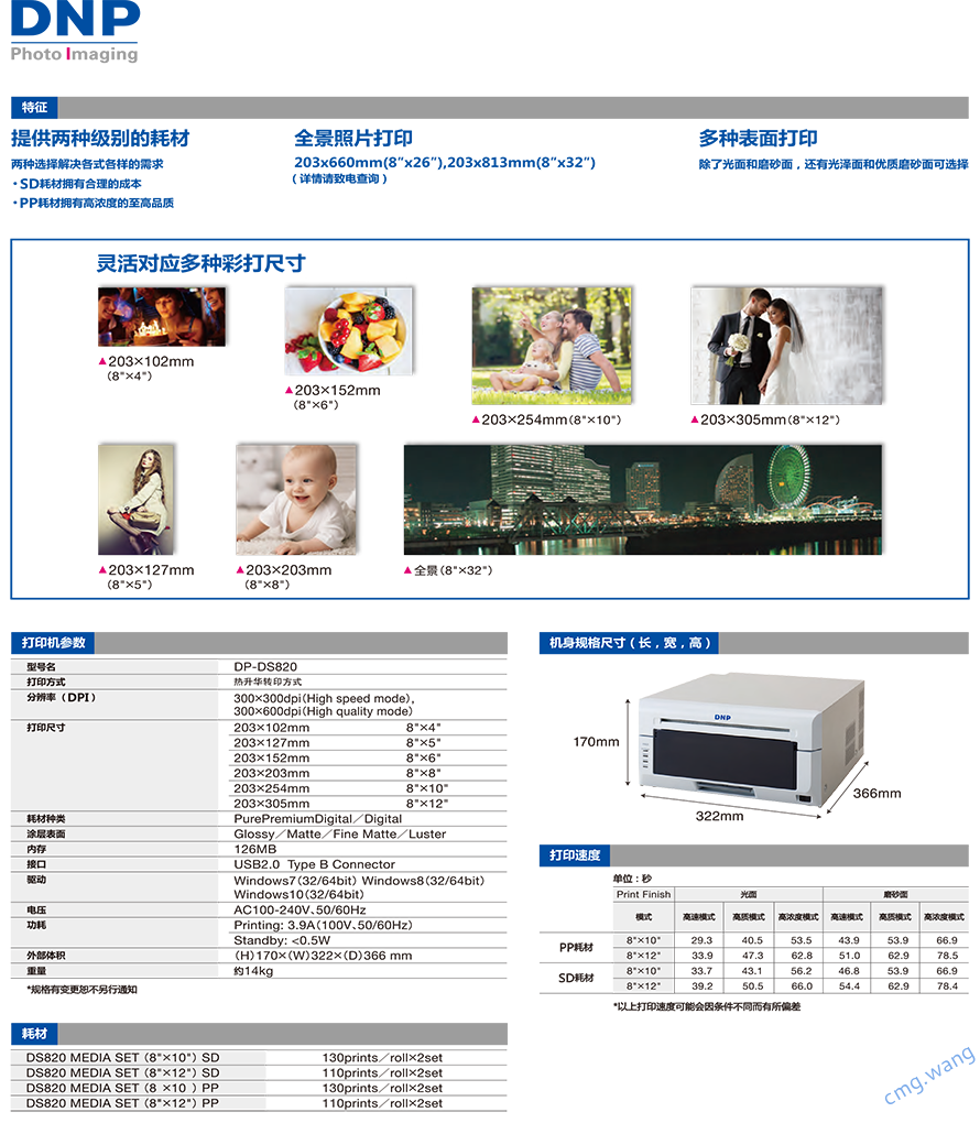DS8208×48×58×68×88×108×12产品特征高品质打印只有热升华才能够实现的柔和表现,提供高画质的光滑表面和磨砂表现提供两种级别的耗材两种选择解决各式各样的要求・SD耗材具有合理的成本・PP耗材拥有高浓度的至高品质全景照片打印203x660mm(8"x26"),203x813mm(8"x32")(详情请致电查询)多种表面打印除了光面和磨砂面,还